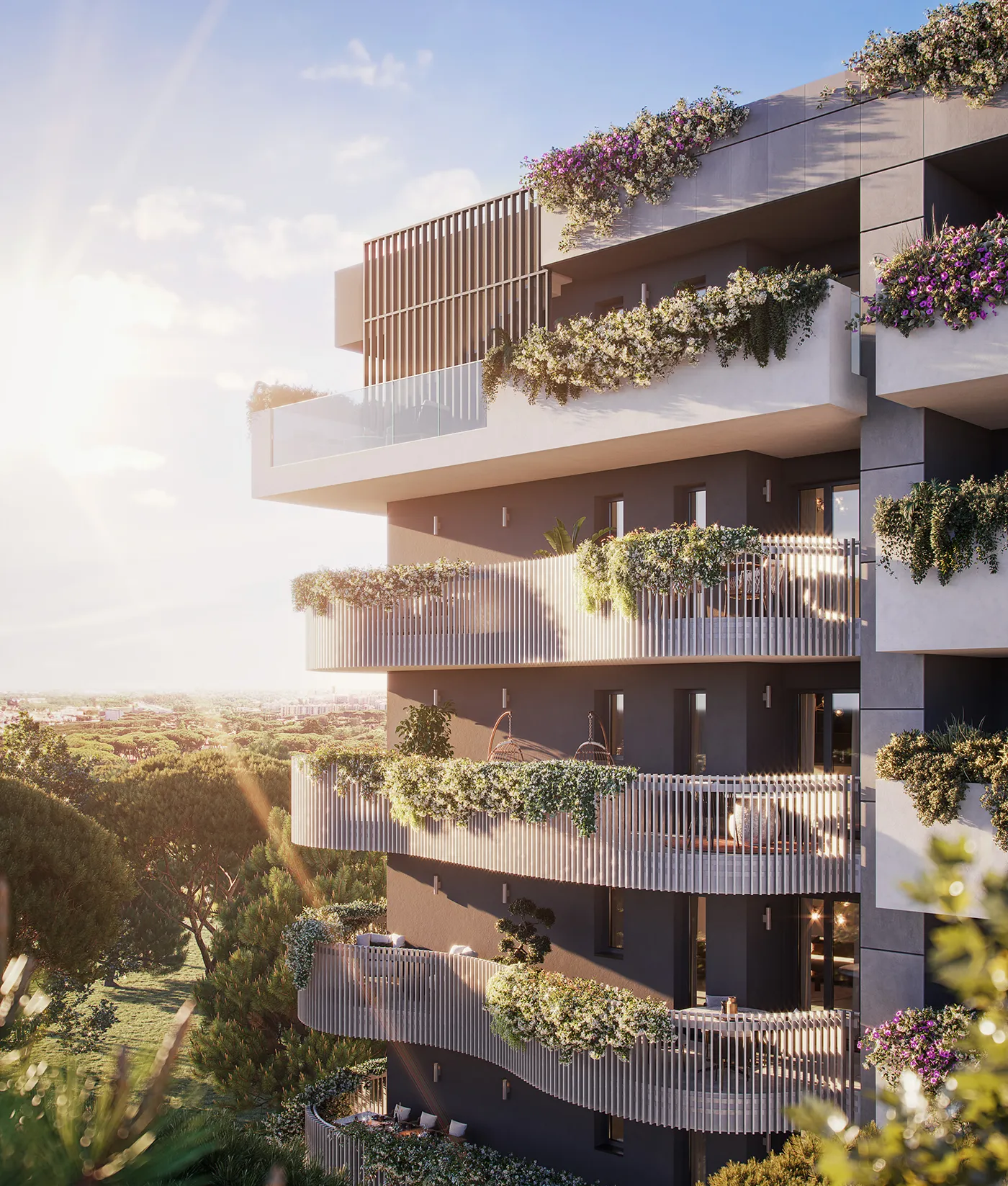L'architettura di Eurora Living è una testimonianza dell'idea contemporanea di residenza, dove linee pulite e volumetrie sofisticate si incontrano per creare un insieme armonioso. Ogni balcone e terrazza fluisce in modo continuo lungo la superficie, sospesi tra cielo e terra, offrendo spazi privati dove l'esterno si fonde con l'interno, invitando gli abitanti a vivere in simbiosi con il paesaggio circostante.